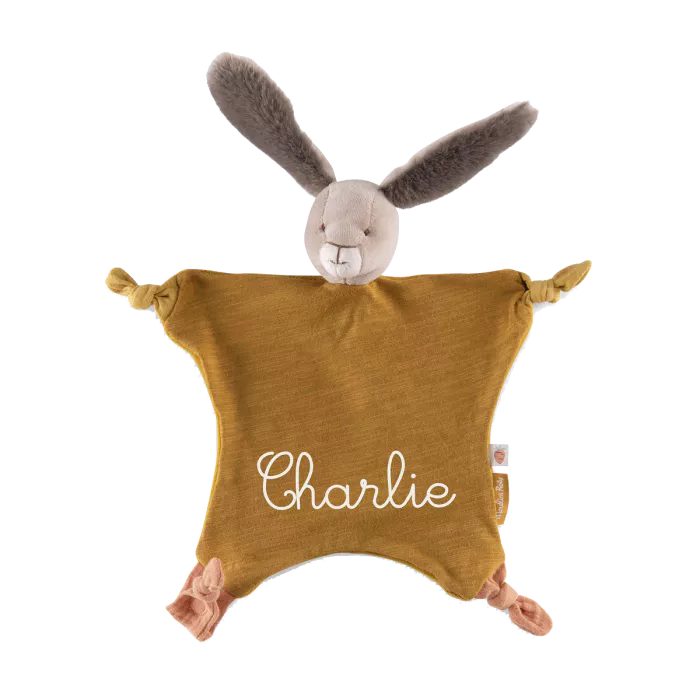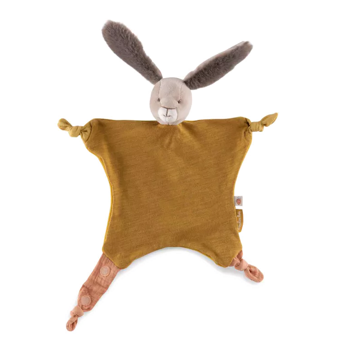 Le Doudou Lapin Ocre, issu de la collection Trois Petits Lapins de Moulin Roty, est conçu pour offrir douceur, confort et tendresse dès les premiers instants de la vie. Ce compagnon plat au motif lapin arbore des grandes oreilles en bi-matières, un attache-tétine intégré et un toucher agréable pour les petites mains.