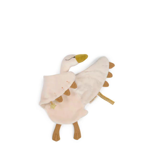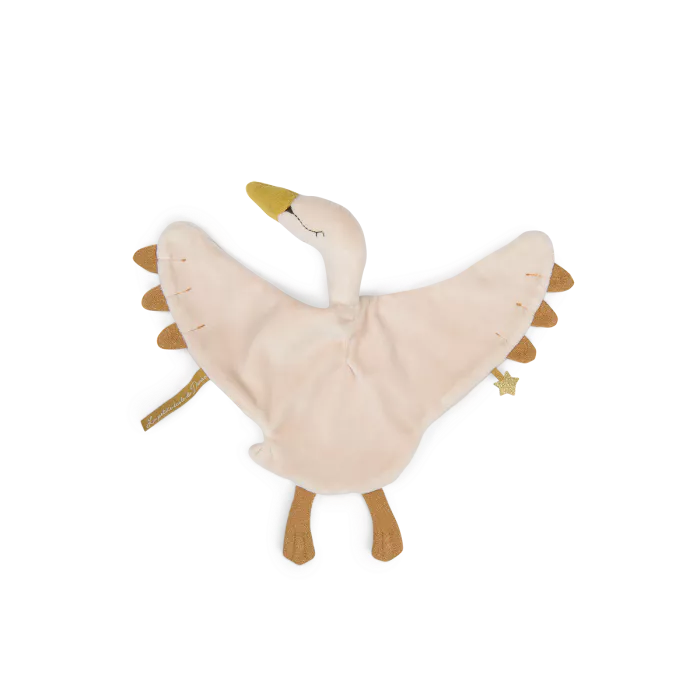 Ce Doudou Cygne dorée est plat, ce qui le rend facile à saisir pour les petites mains. Il combine une face en éponge velours crème pour une texture moelleuse et une touche poudrée, et des plumes en jersey doré qui apportent une note de brillance raffinée. Le bec, en finition dorée, est subtilement mis en valeur pour renforcer le charme visuel.