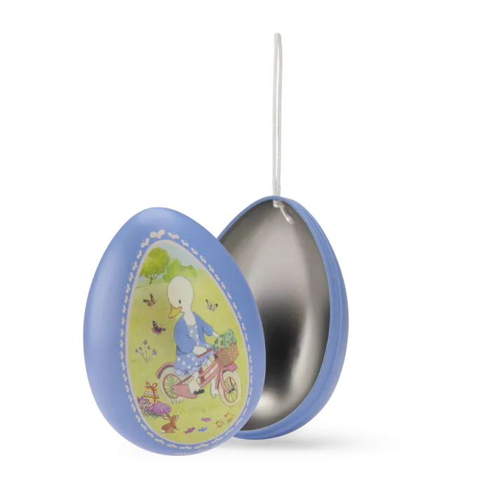 Chacune des deux faces de l’œuf raconte une scène pleine de vie et de tendresse : côté pile, Jeanne la cane pédale joyeusement à vélo dans la campagne printanière ; côté face, Sylvain le lapin est assis au milieu des animaux du jardin, captivant son audience avec de belles histoires. Ces scènes appartiennent à la collection La Grande Famille, produite par Moulin Roty depuis 1997. Un univers illustré aux crayons de couleur avec une sensibilité rare, qui touche autant les enfants que les parents qui ont grandi avec ces personnages inoubliables.